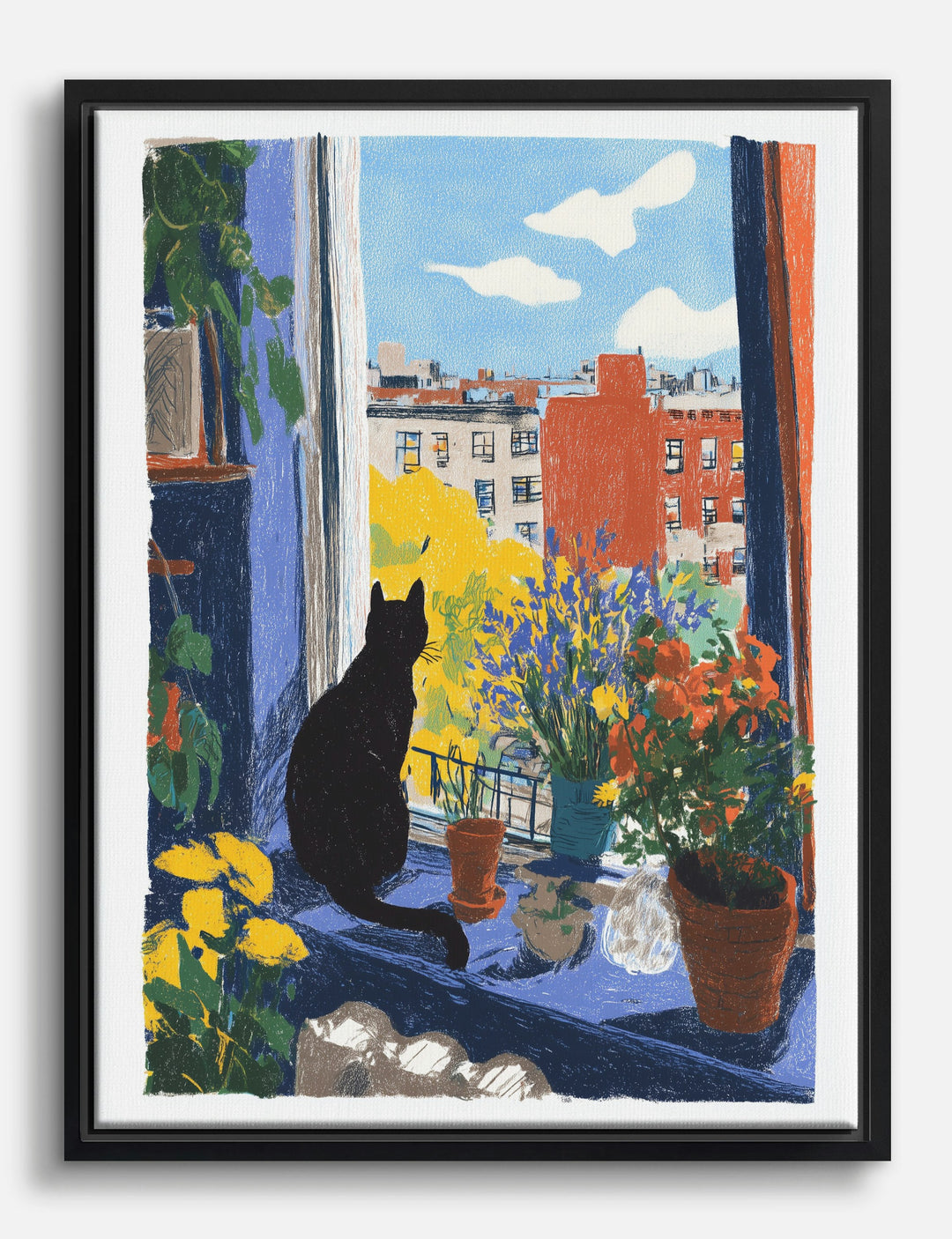 A black cat perches on a sunlit windowsill, taking in the city’s pulse just beyond the blooms. There’s something magical about those everyday moments—a quiet observer, a burst of flowers, the city’s energy humming in the distance.