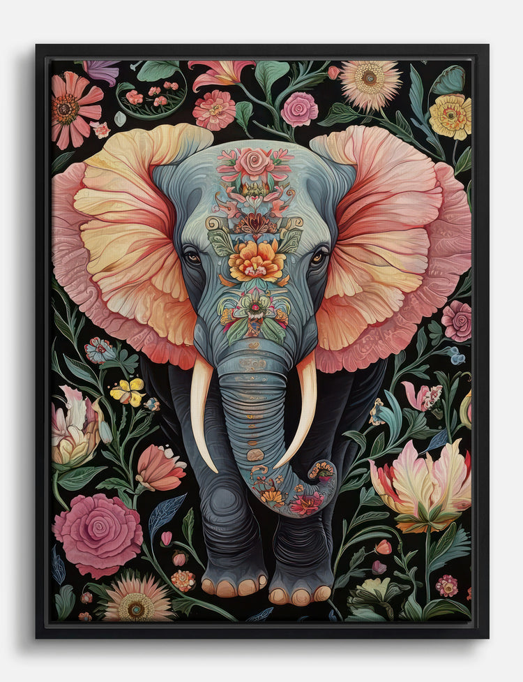 Bold, majestic, and utterly unique—this floral elephant brings instant personality to your walls. With lush pink blooms blooming across its ears and intricate patterns swirling over its trunk, this piece is a celebration of color and creativity.