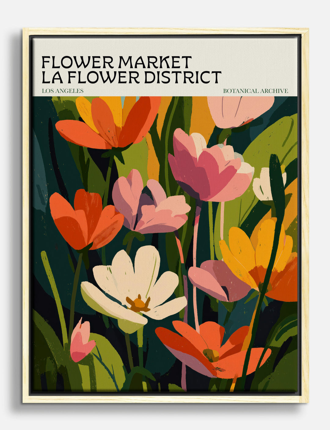 Bold blooms, big energy—this piece turns any wall into a celebration. Vivid oranges, pinks, and creamy whites pop against lush greenery, capturing the magic of LA’s iconic flower market in full swing.