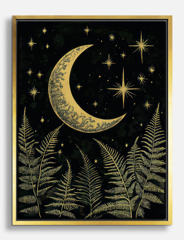 Let your walls glow with a sense of wonder—this enchanting crescent moon floats above delicate ferns, casting a golden shimmer across a midnight sky. The vintage-inspired palette adds a touch of magic and nostalgia, instantly elevating your space.