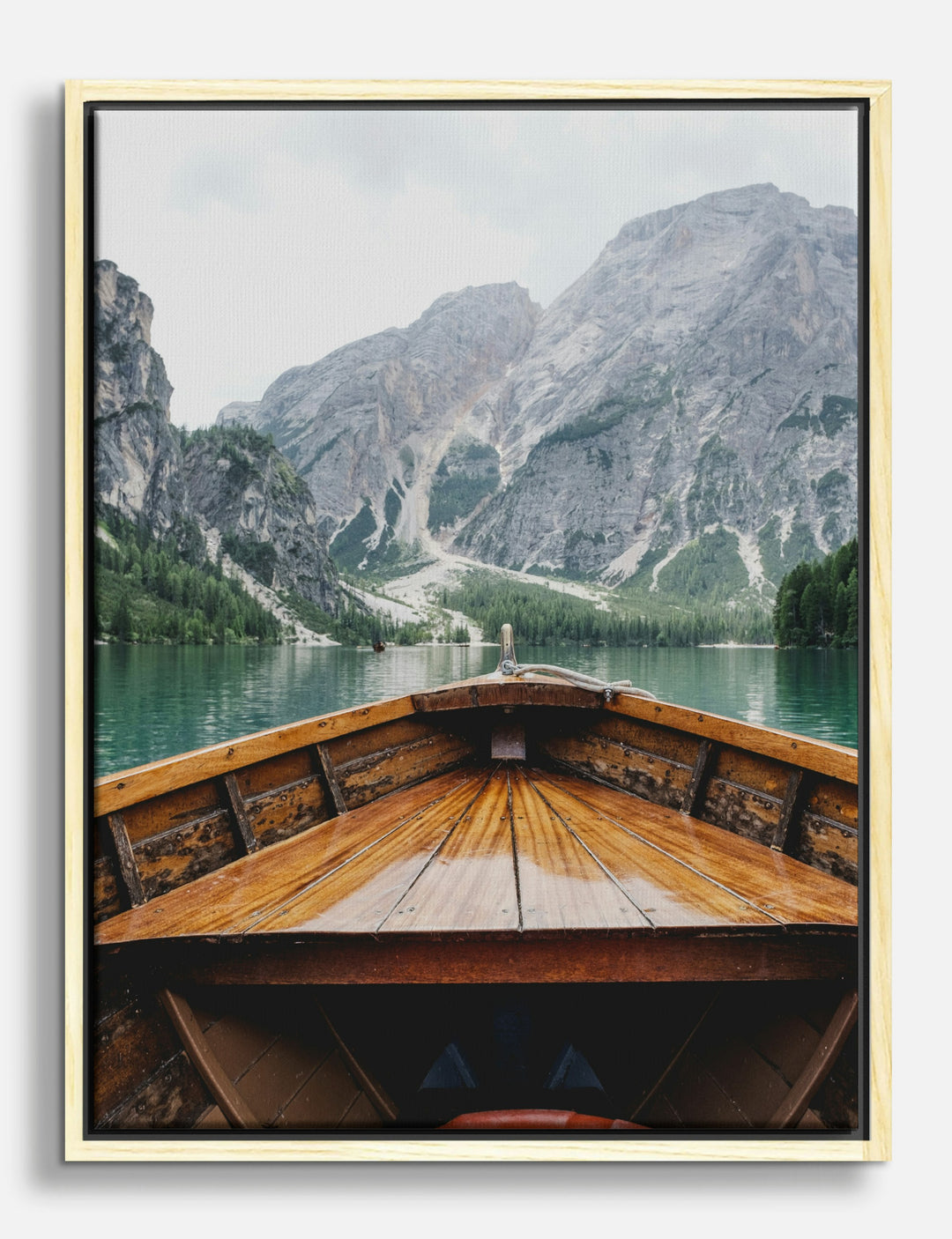There’s something about the view from a wooden boat that instantly invites a sense of calm adventure. Picture this tranquil scene in your living room or bedroom—where the rich wood tones and cool mountain blues blend effortlessly with both modern and rustic decor.