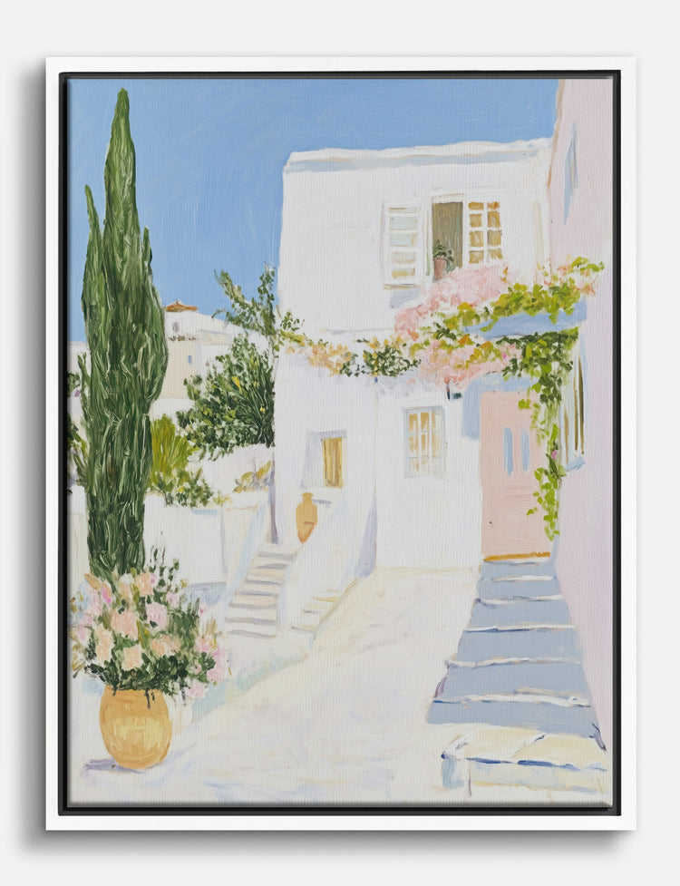 Sun-bleached walls, a pop of pink blooms, and the hush of a quiet afternoon—this piece instantly transports you to a serene Mediterranean courtyard. It’s the kind of art that brings a fresh, airy feel to your living room or bedroom, making every day feel like a gentle escape. The soft whites, blush tones, and leafy greens pair effortlessly with both modern and classic decor, letting your space bloom with style and calm. Add a dash of wanderlust to your walls—no passport required.
