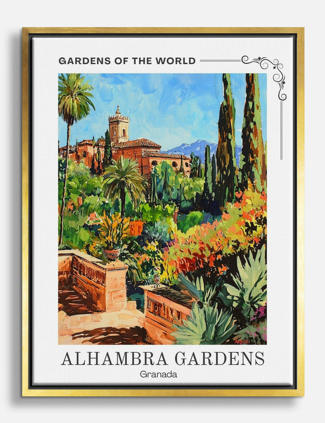 Step into a world of vibrant greenery and historic charm with this stunning Alhambra-inspired piece. Perfect for your living room or office, it brings a splash of color and a sense of wanderlust. The rich greens and warm tones blend effortlessly with various decor styles, making it a versatile choice. Let your walls tell a story of beauty and adventure.