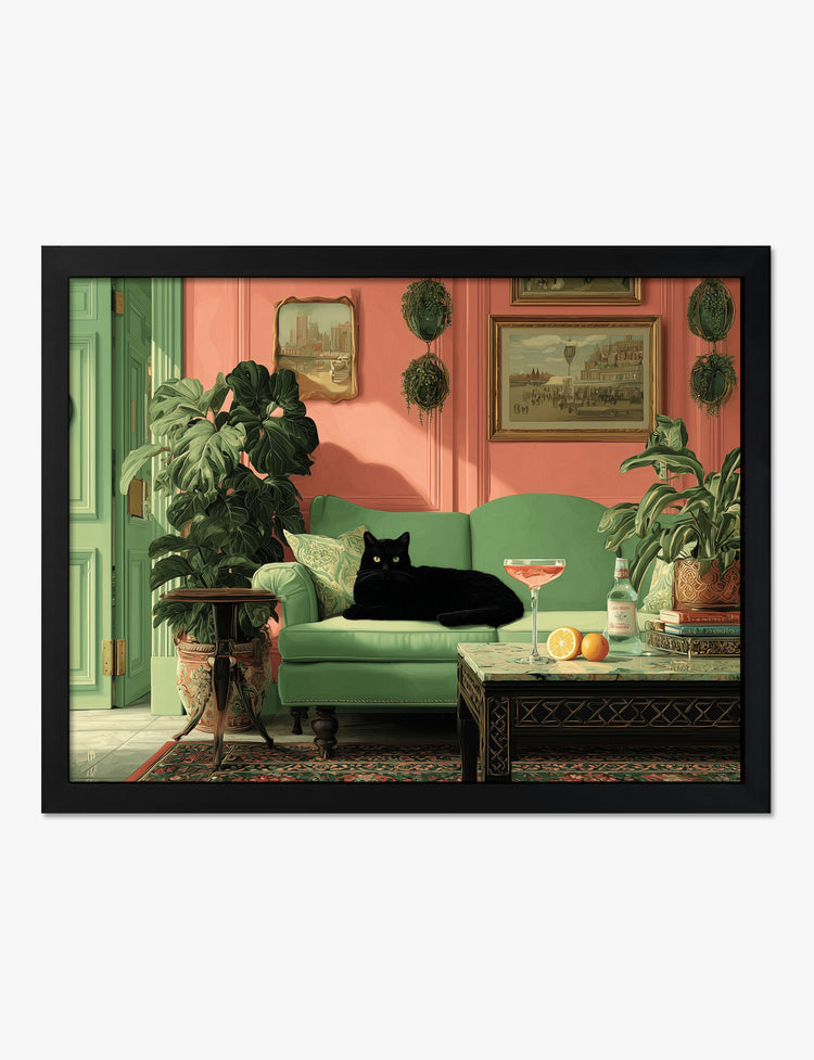 A black cat sprawled on a mint-green sofa brings instant cool to your space. This piece radiates laid-back charm and a hint of mystery, inviting you to slow down and savor the moment. The lush plants, coral walls, and vintage touches deliver major style—no design degree required. Whether you pop it in your living room or cozy up your bedroom, it’s a quick way to give your home that “wow, you’ve got great taste” vibe. Soft greens and warm corals play beautifully with modern and vintage decor alike, making this print a versatile showstopper. You’ll love the playful mix of elegance and comfort every time you walk by. Let your walls show off your personality—because style should always feel this easy.