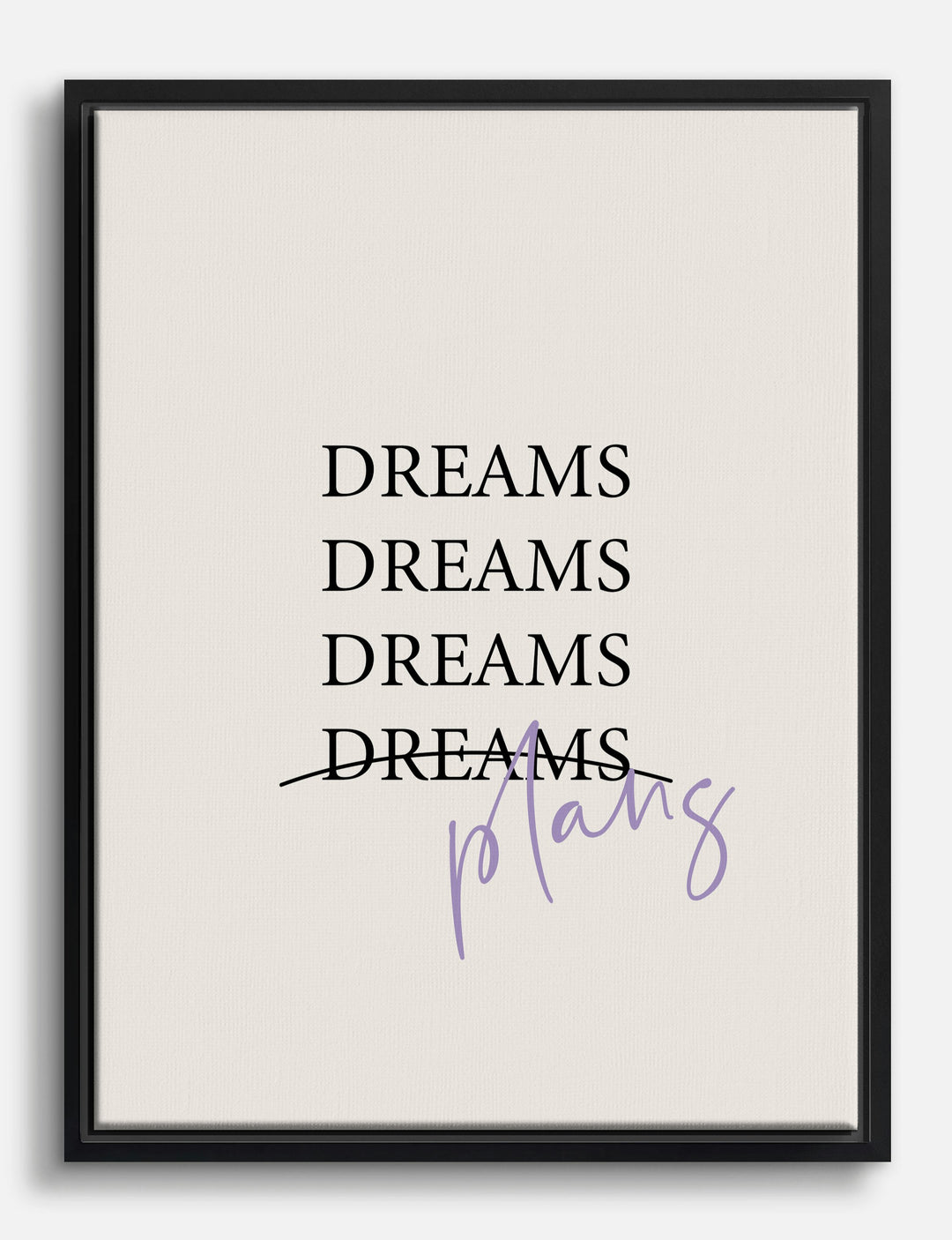 Swap wishful thinking for bold action with this chic, minimalist piece. Crisp black typography is playfully interrupted by a handwritten “plans” in soft lavender, turning dreams into motivation right on your wall.