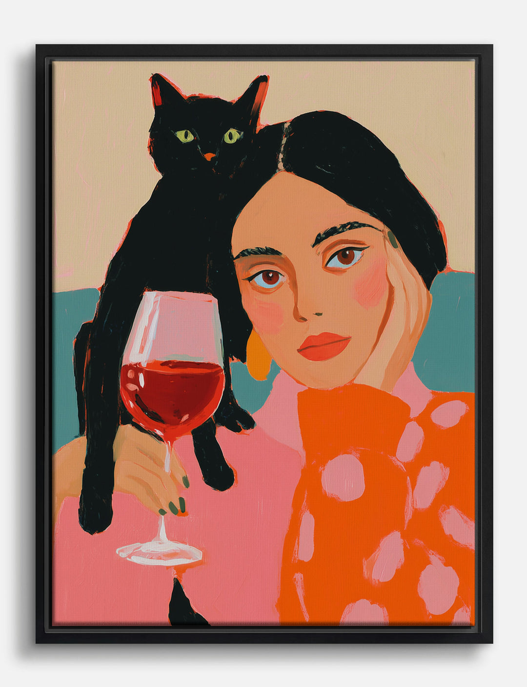 Fehlt Ihrem Raum noch ein Hauch Persönlichkeit? Dieses verspielte Leinwandbild zeigt eine Frau, ihre treue schwarze Katze und ein Glas Rotwein – und bringt augenblicklich Charme und Wärme in jedes Zimmer. Kräftige, moderne Farben – von poppigen Pinktönen über tiefes Schwarz bis zu einem Spritzer Rot – machen es zum Blickfang, der so stilvoll ist wie Sie. Ob im Wohnzimmer für eine gemütliche, gesprächsanregende Atmosphäre oder im Schlafzimmer als verspielter Akzent: Dieses Motiv feiert die kleinen Momente des Alltags mit Esprit. Es passt sowohl zu minimalistischer als auch zu eklektischer Einrichtung und macht es Ihnen leicht, Ihrem Zuhause eine unverwechselbare Note zu verleihen. Freuen Sie sich jedes Mal, wenn Sie den Raum betreten – denn großartiger Stil (und ein bisschen Spaß) ist zum Greifen nah.