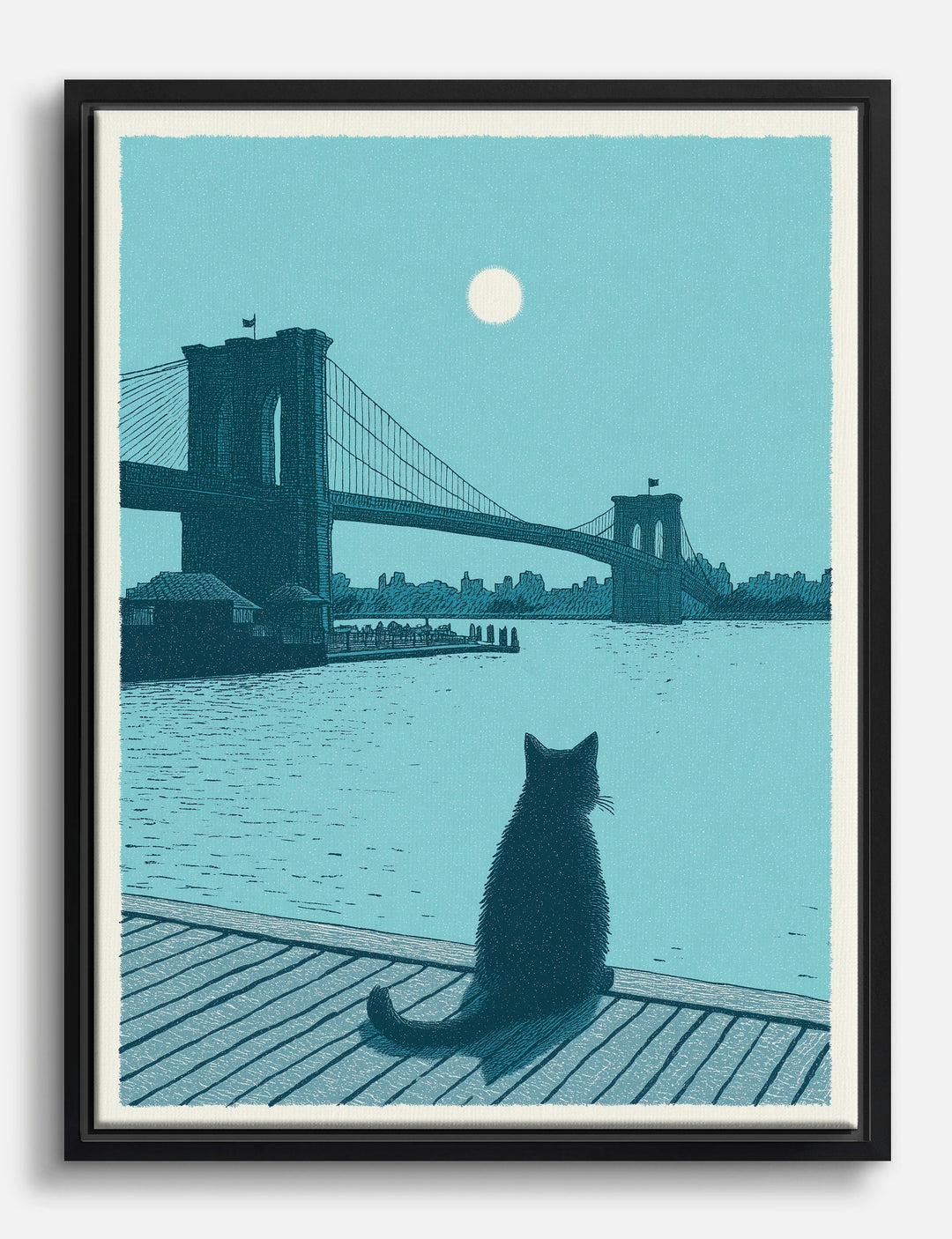 A quiet moment on the waterfront, where city lights meet feline curiosity. This piece captures the wonder of a cat gazing across the river at the iconic Brooklyn Bridge, bathed in soothing blue tones and gentle moonlight.
