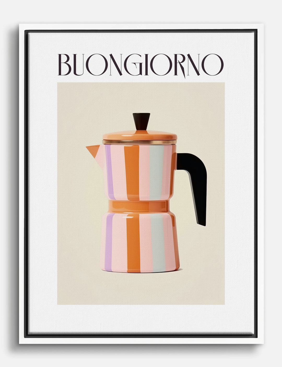 Bold stripes and a cheerful palette bring a playful twist to your morning ritual. This lively moka pot print instantly energizes any space, making every day feel like a fresh start. Imagine it in your kitchen or breakfast nook, where its warm pinks, oranges, and purples pop against both modern and vintage décor.