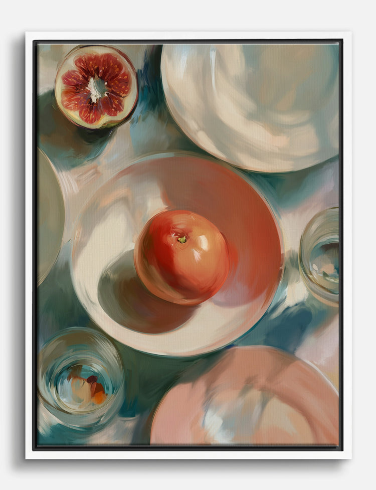 A single pomegranate, glowing at the center of soft, sun-washed plates, invites a moment of everyday beauty into your space. There’s a quiet magic in how light and color mingle here, making even a simple table feel like a celebration.