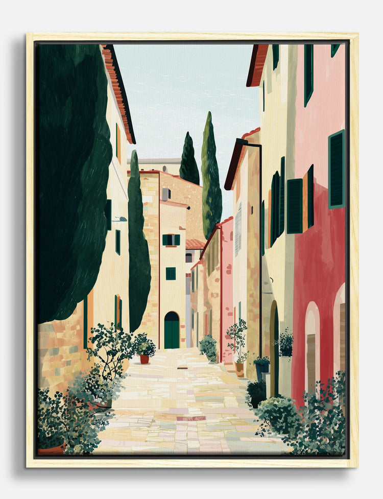 Step into a sun-soaked stroll through Tuscany every time you glance at your wall. This charming print captures the warmth of rustic stone, pastel facades, and cypress trees lining a peaceful alleyway—inviting you to slow down and savor the beauty of everyday moments.