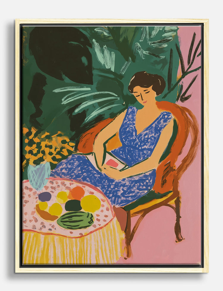 Sun-drenched tranquility meets bold color in this inviting piece. A woman in a vibrant blue dress relaxes in a cozy chair, surrounded by lush greenery and the easy elegance of a sunny patio. The playful mix of pink, green, and yellow instantly lifts the mood—perfect for making your living room or bedroom feel like your own personal retreat.