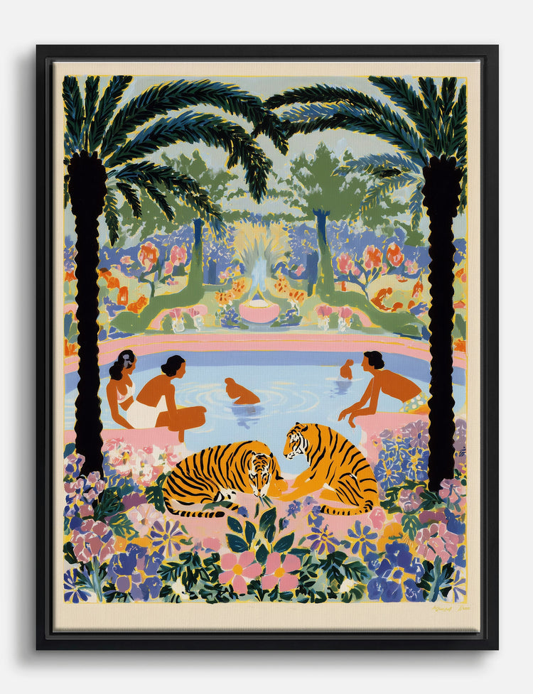 Step into a world where adventure meets relaxation—right on your wall. Vibrant palms, blooming florals, and playful tigers set the scene for this lush poolside gathering, inviting a sense of wonder and warmth into your favorite space.