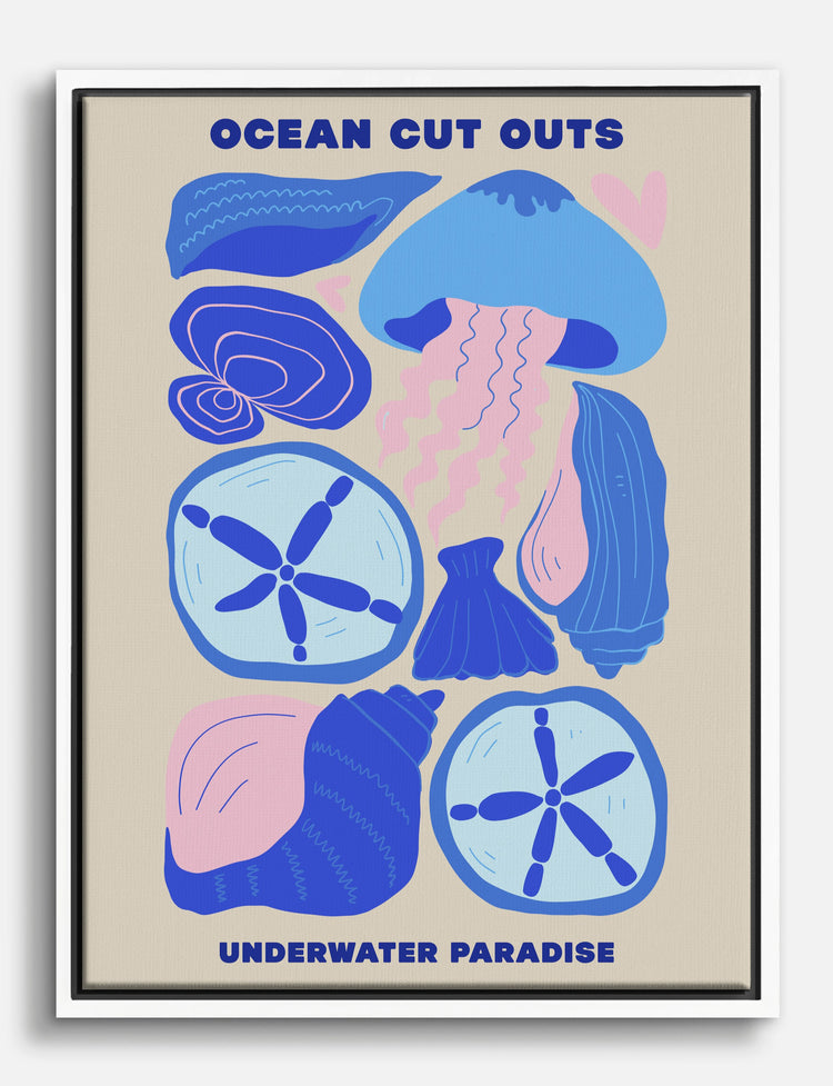 Dive into a playful world of ocean treasures with this vibrant piece. Bold blues, soft pinks, and whimsical shapes bring a splash of seaside joy to any space.
