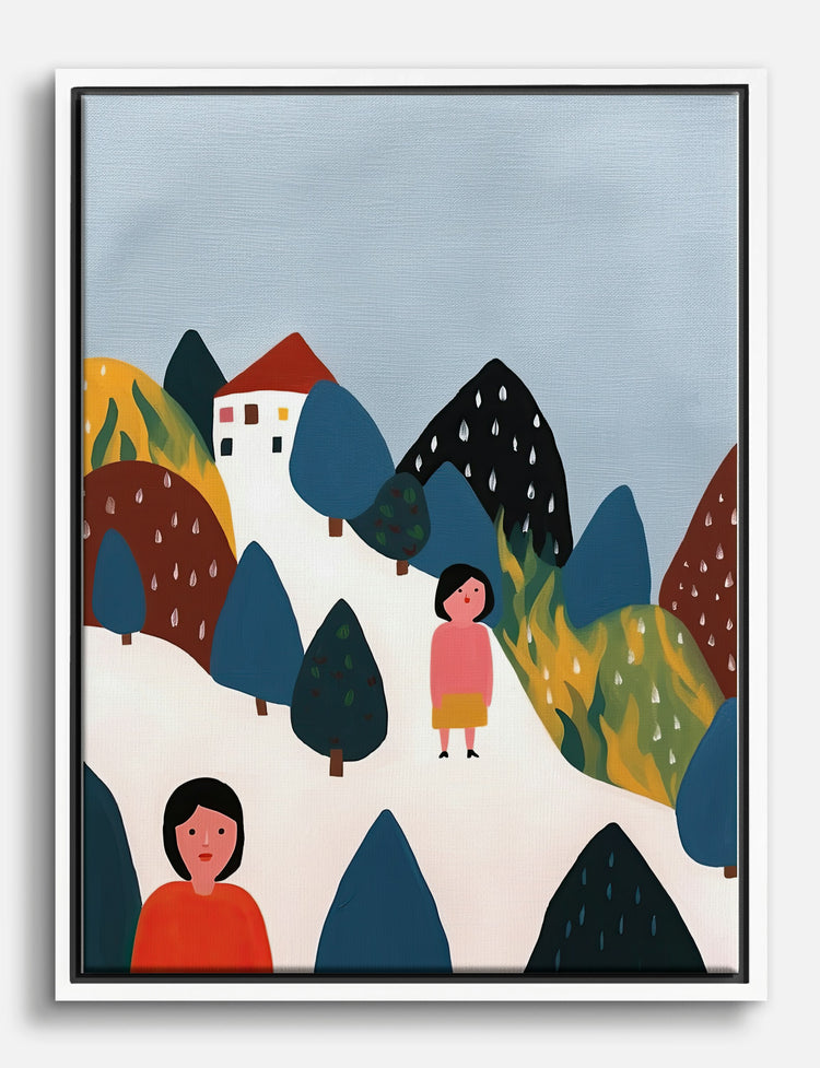 A winding path through playful, stylized hills invites you to step into a world where imagination leads the way. Pops of deep blue, warm earth, and cheerful red create a lively vibe that instantly energizes your space. Place this piece in your living room or bedroom and let its charming simplicity remind you that great style doesn’t have to be complicated. With every glance, youll feel a sense of wonder and warmth — the kind that makes a house feel like home.