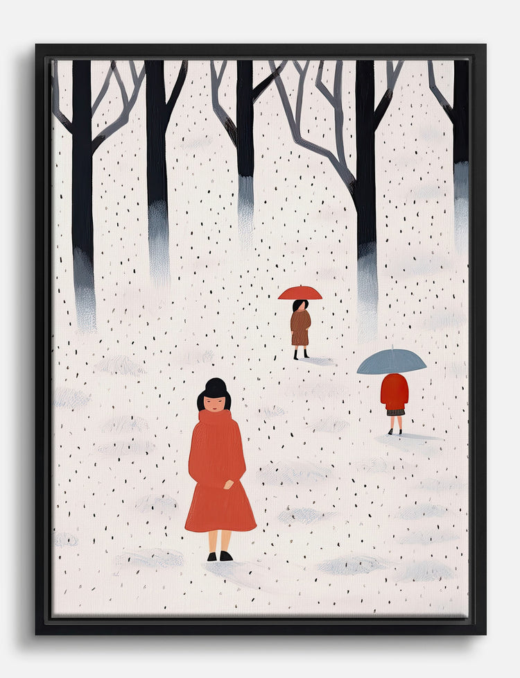 A gentle snowfall transforms this scene into a quiet wonderland, where pops of red and blue invite warmth and curiosity. You’ll love how this piece brings a sense of calm and subtle story to your living room or bedroom — perfect for those who crave a touch of whimsy and modern style. The soft, neutral background pairs effortlessly with bold or minimalist decor, making it easy to refresh your space and express your unique taste.