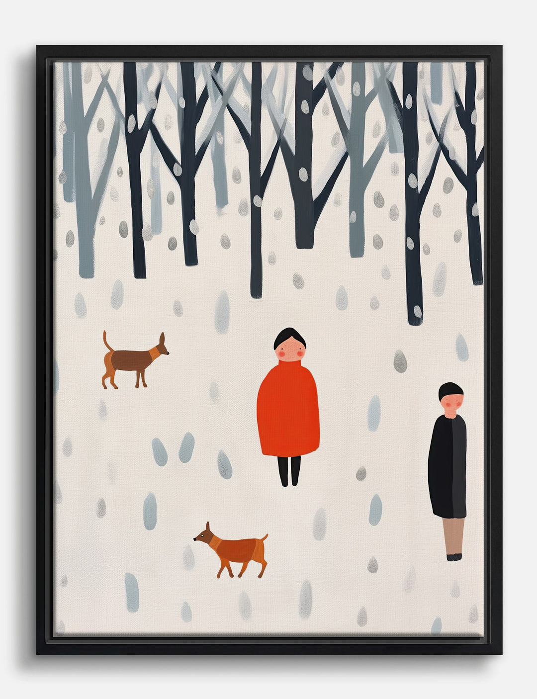 Step into a peaceful winter wonderland every time you glance at your wall. This charming scene captures the quiet magic of snowy days, with playful pups and bundled-up friends strolling beneath a forest of bare trees. The soft whites and deep blues pop with a cozy splash of red—perfect for adding warmth and whimsy to your living room or bedroom. This piece makes it easy to bring a touch of storybook style and comfort to your home, no matter the season.