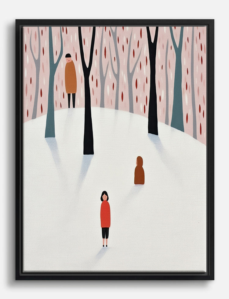 Soft snow and slender trees create a peaceful stage for tiny, bundled figures in this charming scene. You’ll love how the playful pops of red and warm neutrals bring quiet energy to your space, making even the simplest corner feel special. Perfect for a bedroom or hallway, this piece adds a sense of calm and stylish curiosity — a gentle reminder that there’s beauty in every moment, and art should be as approachable as your favorite sweater.
