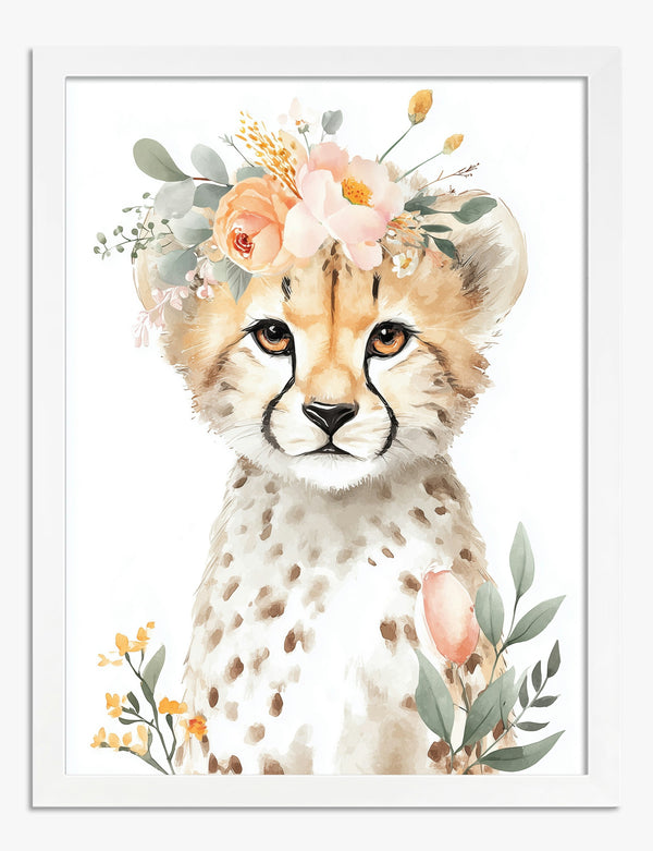 Poster Gepard mit Blütenkrone – Aquarell-Porträt