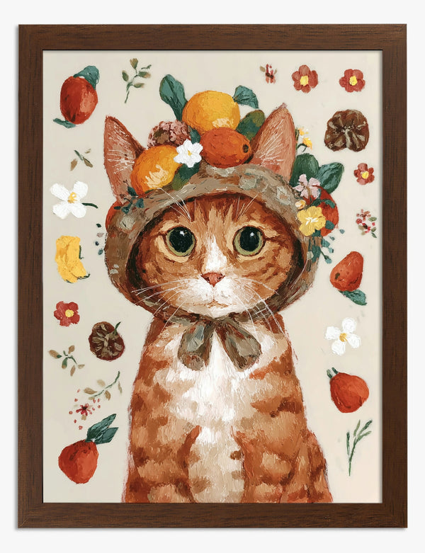 Poster Herbstliche rote Katze mit Obst- und Blumenhaube