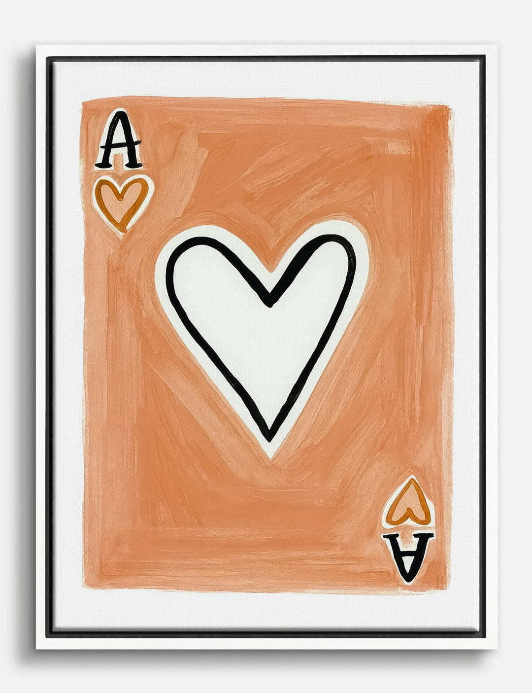 A pop of playful energy, this bold Ace of Hearts brings a fresh twist to a classic icon. The hand-drawn heart, outlined in striking black against a warm tangerine backdrop, instantly sparks joy and adds a dash of personality to your favorite spot. Perfect for your living room or bedroom, this piece radiates comfort and style—making every day feel just a little more special. The soft orange hue pairs effortlessly with neutrals, whites, and even deep jewel tones, so you can make it your own, no matter your decor vibe. Let this artwork remind you that your space is your sanctuary, and great style is always within reach. Hang it up, kick back, and feel the pride of a home that truly reflects you.