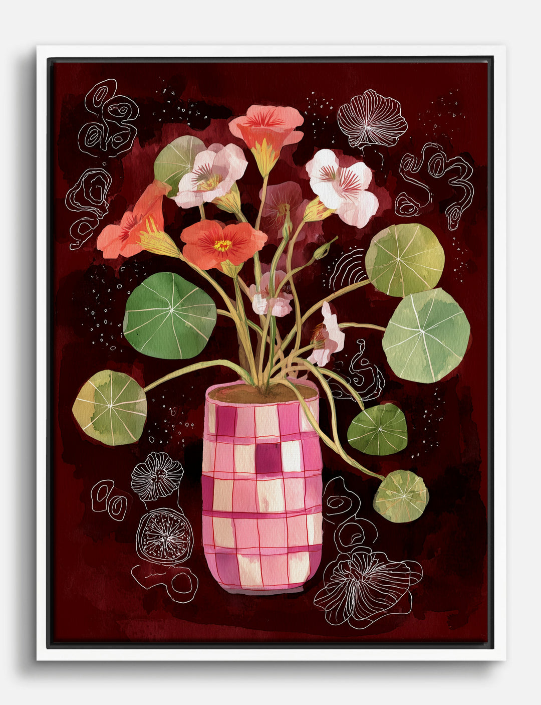 Let your space flourish with the playful energy of these bold, graphic blossoms. Vivid pinks, corals, and fresh greens pop against a rich burgundy background, instantly brightening any room with a splash of personality. This piece is for anyone who wants to bring a bit of joy and artistry into their everyday. It’s a statement-maker that feels both modern and inviting, perfect for your living room, bedroom, or wherever you want a little lift. The geometric vase and stylized flowers blend seamlessly with eclectic, contemporary, or boho decor, while the deep hues make it easy to pair with neutrals or other colorful accents. You’ll love how this print brings a sense of creative pride and warmth to your home—proof that great style is just a frame away.