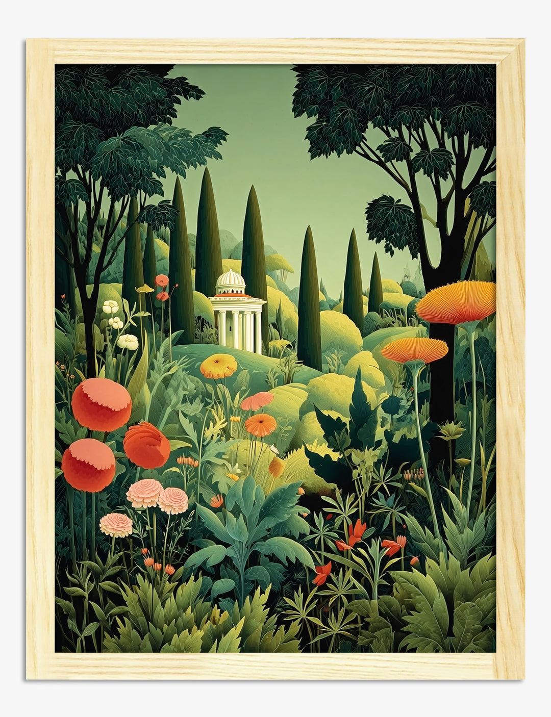Step into a world where wildflowers and timeless elegance meet. This lush botanical scene pops with bursts of coral, orange, and green—inviting you to slow down and savor every detail. Imagine this piece in your living room or bedroom, transforming your space into a tranquil retreat. The gentle curves of the greenery and the distant classical pavilion evoke a sense of wonder and calm, perfect for unwinding after a busy day. The vibrant palette effortlessly complements both modern and vintage decor, adding a layer of storybook charm and sophistication. Let this print be your daily reminder that beauty and serenity are just a glance away—no green thumb required.