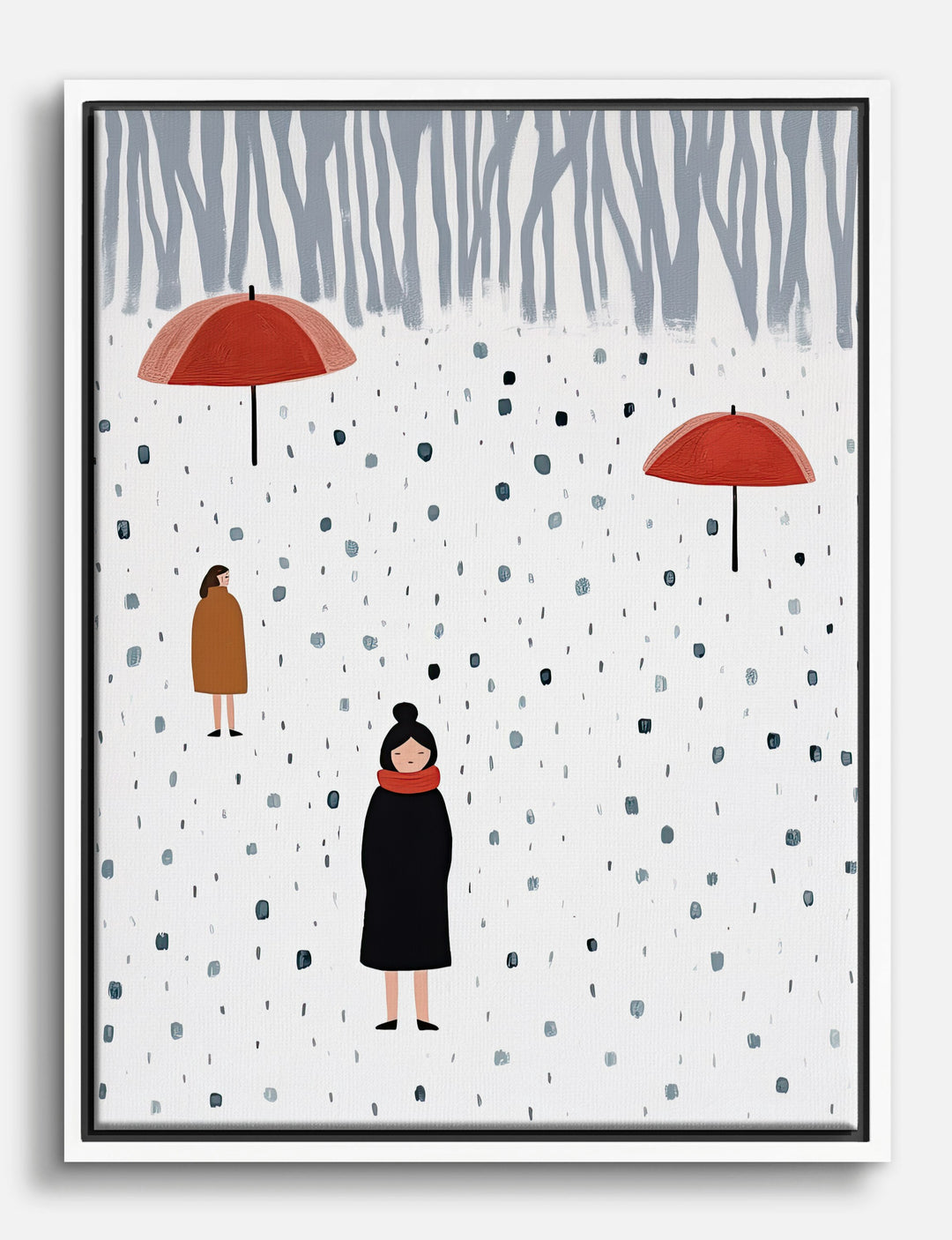 A gentle snowfall transforms the everyday into something magical. Pops of red from floating umbrellas and cozy scarves invite a sense of warmth and whimsy, even on the coldest days. This playful print brings a modern charm to your living room or bedroom, pairing beautifully with both neutral and colorful decor. You’ll love the way it sparks conversation and adds an artful twist to your favorite space—proof that style and comfort can go hand in hand.