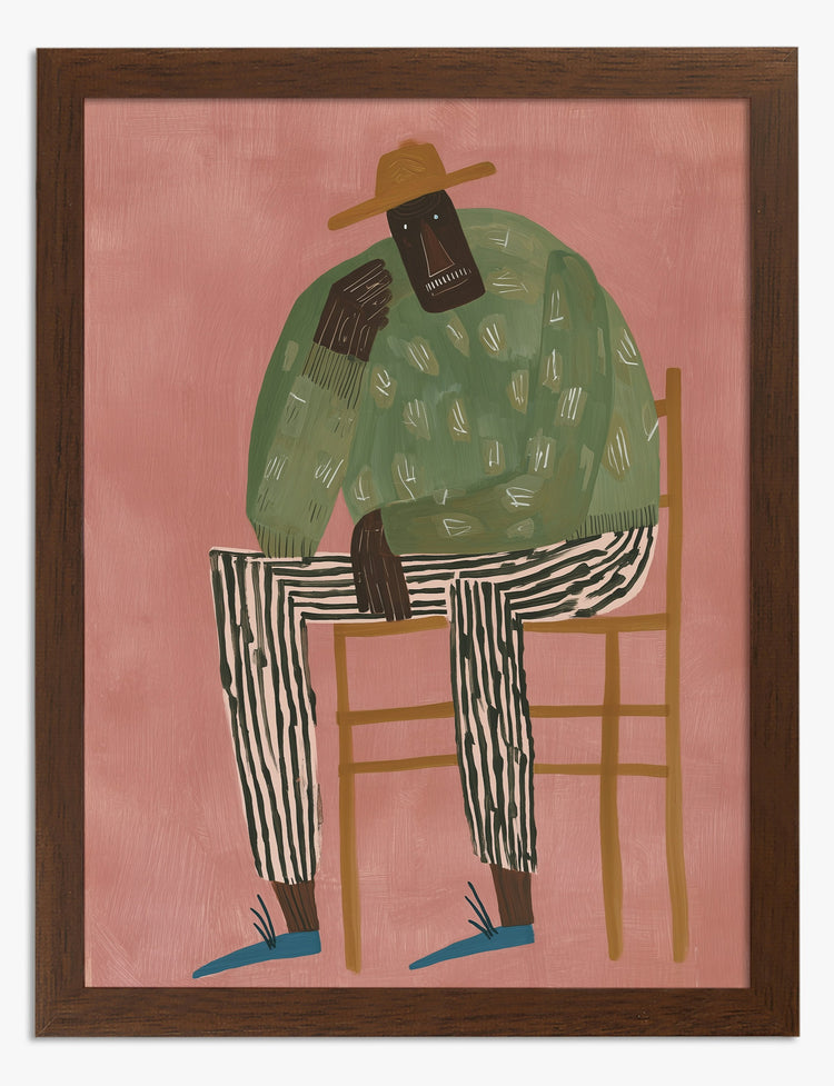 Ever notice how a single piece can change the entire vibe of your room? This striking portrait, with its bold lines and playful proportions, brings a fresh burst of personality wherever it hangs. The earthy green jumper and striped pants pop against a warm blush background, making this piece feel both grounded and full of life. Perfect for your living room or bedroom, it’s a conversation starter that invites you—and your guests—to pause and smile. The color palette works wonders with both modern and eclectic decor, adding a layer of effortless, curated style. Let your space say something unique about you. With this print, you’ll feel the pride of a home that reflects your one-of-a-kind taste—no renovation required.
