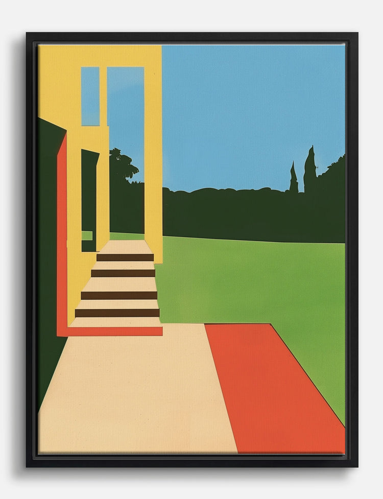 Step into a world where bold geometry meets serene landscapes. This piece, with its striking blocks of color and minimalist design, brings a touch of modern elegance to any room. Perfect for your living room or office, it effortlessly complements both contemporary and classic decor. Let the warm hues and clean lines inspire pride and creativity in your space, making your home a reflection of your unique style.