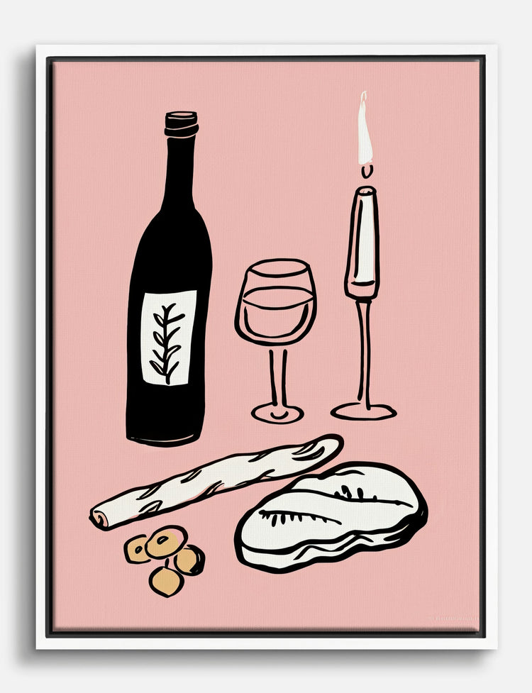 There’s something magical about a table set for a simple, soulful meal. A bottle of wine, fresh bread, and glowing candlelight come together in this playful piece, inviting you to savor life’s little luxuries every day.
