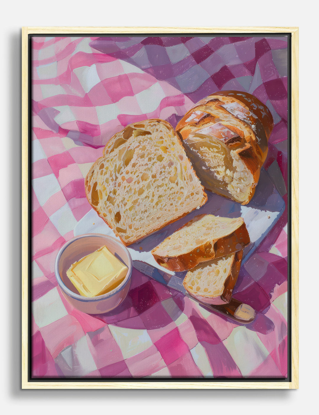 Warm sunlight, a fresh loaf, and creamy butter—this piece brings everyday comfort right to your walls. The playful pink checkered backdrop pops with personality, making any kitchen or dining nook instantly more inviting.