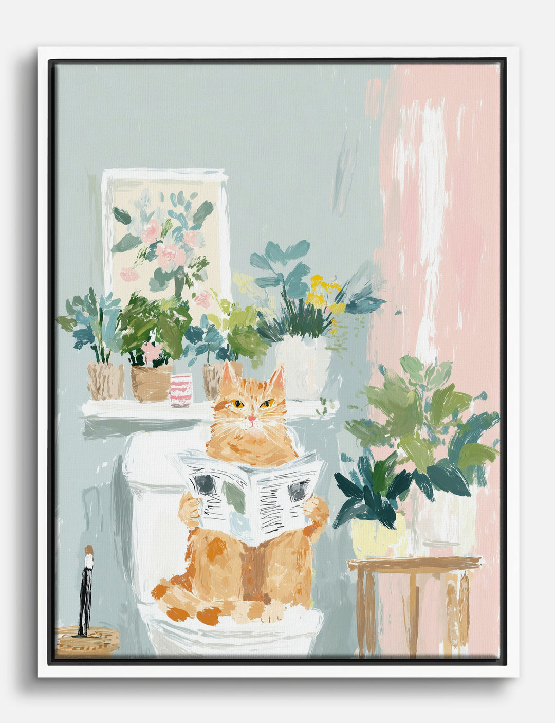 Who says style and humor can’t share the same space? This playful piece brings a fresh twist to your walls, starring a ginger cat caught in a moment of pure relaxation—newspaper in hand, surrounded by lush greenery.