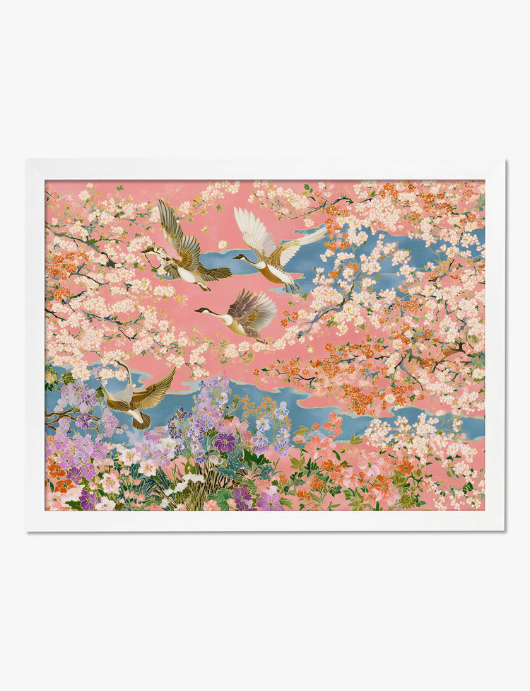 Puderrosa Blütenblätter und anmutige Vögel lassen Ihren Raum im Handumdrehen aufblühen und holen die Schönheit des Frühlings das ganze Jahr über nach drinnen. Dieses Motiv steht für Neuanfang und sanfte Bewegung – als würden Sie die Fenster öffnen und eine Brise voller Möglichkeiten hereinlassen. Die weichen Rosatöne und ruhigen Blautöne harmonieren mühelos mit moderner wie klassischer Einrichtung und verleihen Wärme, ohne den Raum zu überladen. Hängen Sie das Poster über Ihr Bett für eine beruhigende, romantische Note, oder lassen Sie es Ihr Wohnzimmer mit einem Gefühl von Erneuerung erhellen. Bei jedem Vorbeigehen hebt es die Stimmung – und erinnert daran, dass Ihr Zuhause ein Ort der Freude, des Stolzes und Ihres persönlichen Stils ist. Mit Fab wird die Verwandlung Ihres Zuhauses so einfach wie die Wahl der Kunst, die zu Ihnen spricht.