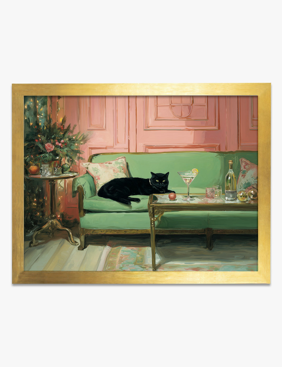 A black cat sprawled on a mint-green sofa brings instant charisma to your space—like the chic guest who always knows how to make an entrance. This playful scene pops with personality, inviting a sense of both whimsy and refinement into your living room or bedroom. Blush pink walls and sparkling cocktail glasses hint at festive gatherings and cozy evenings alike, making this piece perfect for anyone who loves a touch of vintage glamour. The green and pink palette is surprisingly versatile, blending effortlessly with classic, modern, or eclectic decor. You’ll feel a little prouder of your space every time you spot this feline lounging in style. It’s proof that great taste—like a great party—should always feel welcoming and fun.