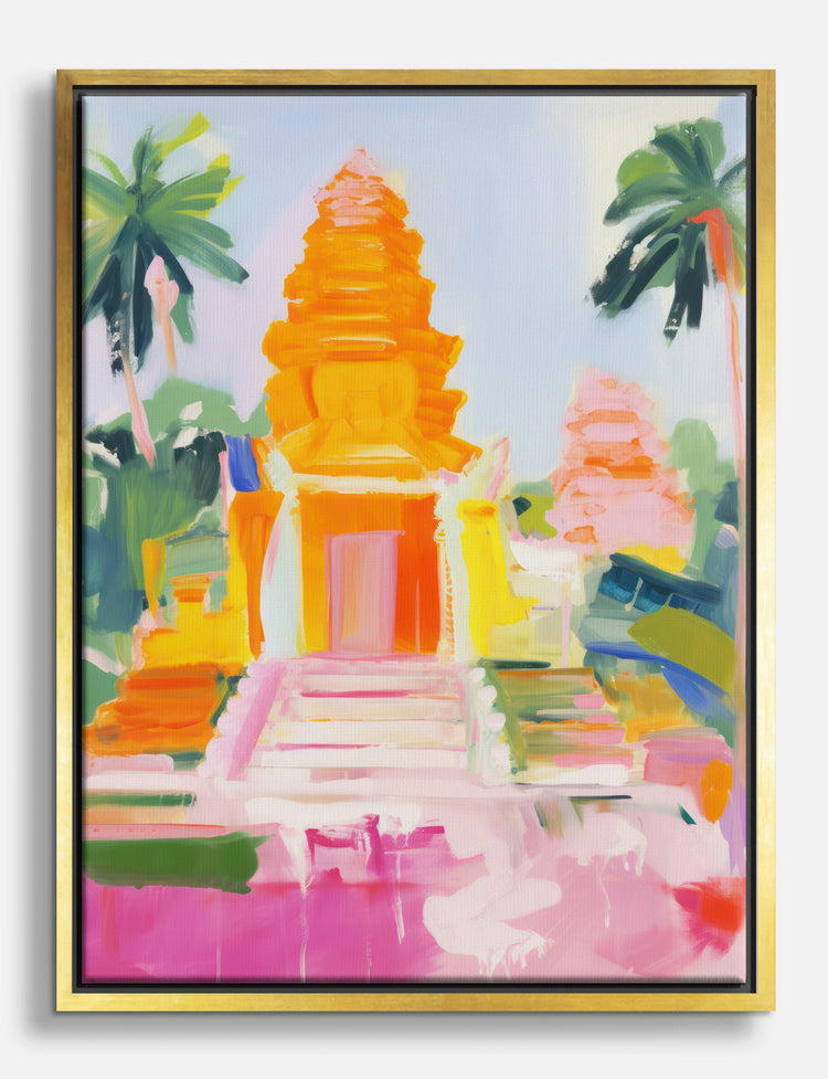 Sun-soaked colors and bold brushstrokes bring a burst of energy to your space—this piece radiates warmth and wanderlust. Feel instantly transported every time you walk by, as golden temples and tropical palms pop with joy and adventure.