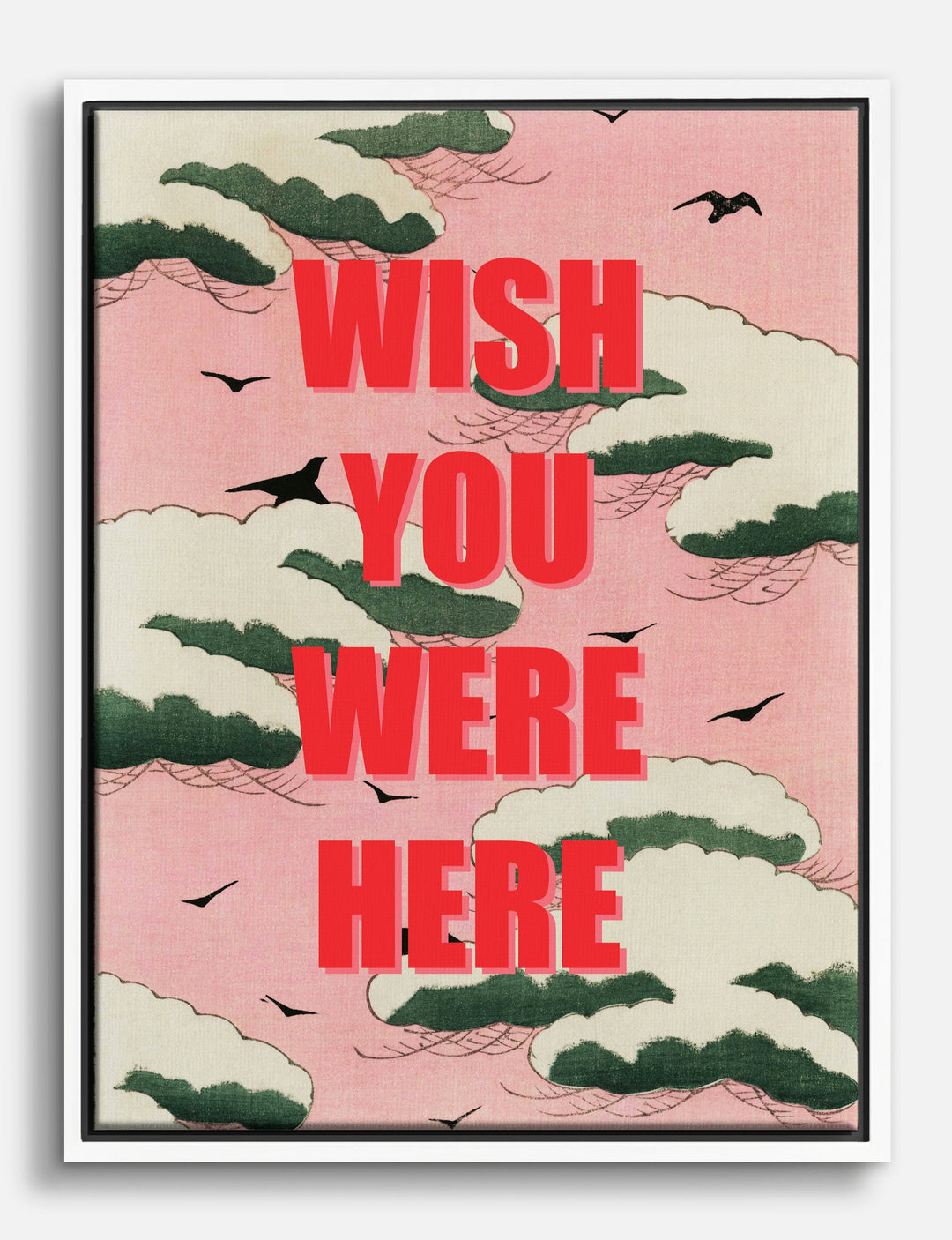 Clouds drift by on a dreamy pink sky, while bold red letters send a message straight from the heart: “Wish You Were Here.” This piece brings instant warmth and nostalgia to your space, like a cherished postcard from a faraway friend.