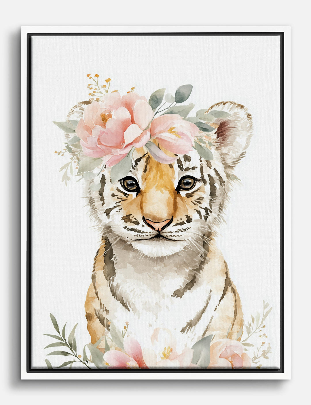 A burst of sweetness and strength, this charming tiger cub—crowned with soft watercolor florals—instantly brightens any room. Its gentle gaze and playful blooms create a mood that’s equal parts uplifting and serene, perfect for spaces where you want to feel cozy and inspired.