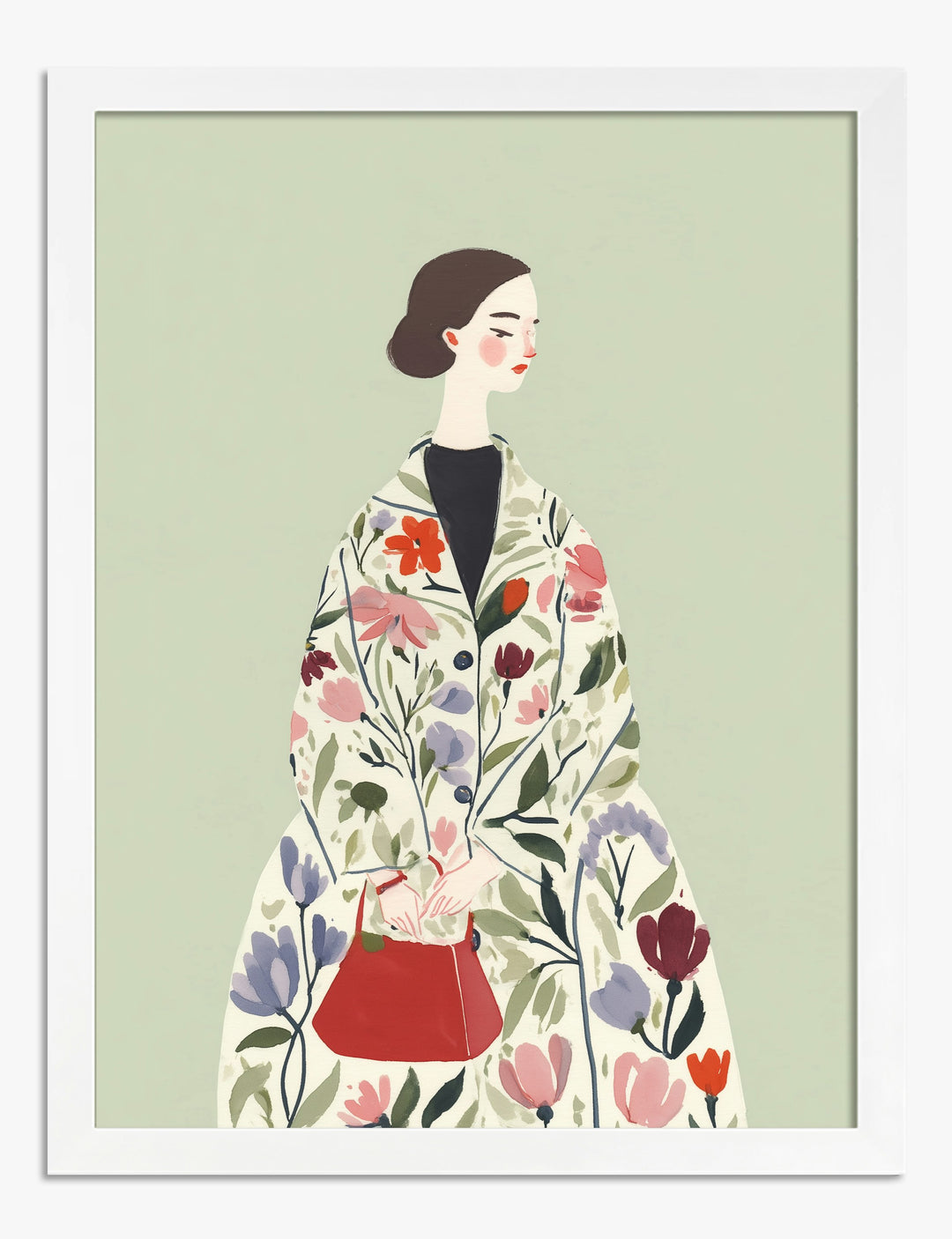 Florals never go out of style—especially when they’re this bold. This charming piece captures a woman wrapped in a coat of blooming color, blending confidence with a soft, feminine touch. Perfect for your bedroom or entryway, it instantly brings life and personality to any corner. The pastel green background and vibrant florals pair beautifully with modern or vintage decor, adding a fresh pop without overwhelming your space. Let this print be your daily reminder to embrace your unique style. It’s effortless, expressive, and guaranteed to spark joy every time you walk by. Affordable, eye-catching, and so you—this is the easiest way to make your home feel truly yours.