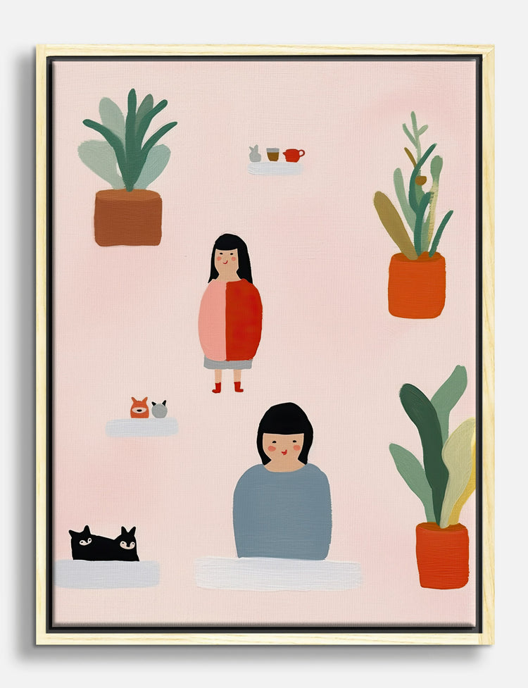 A playful mix of lush potted plants, charming little figures, and a curious black cat brings instant warmth to your space. This delightful piece infuses your walls with a whimsical, laid-back vibe—perfect for creating a corner that feels both fresh and friendly.