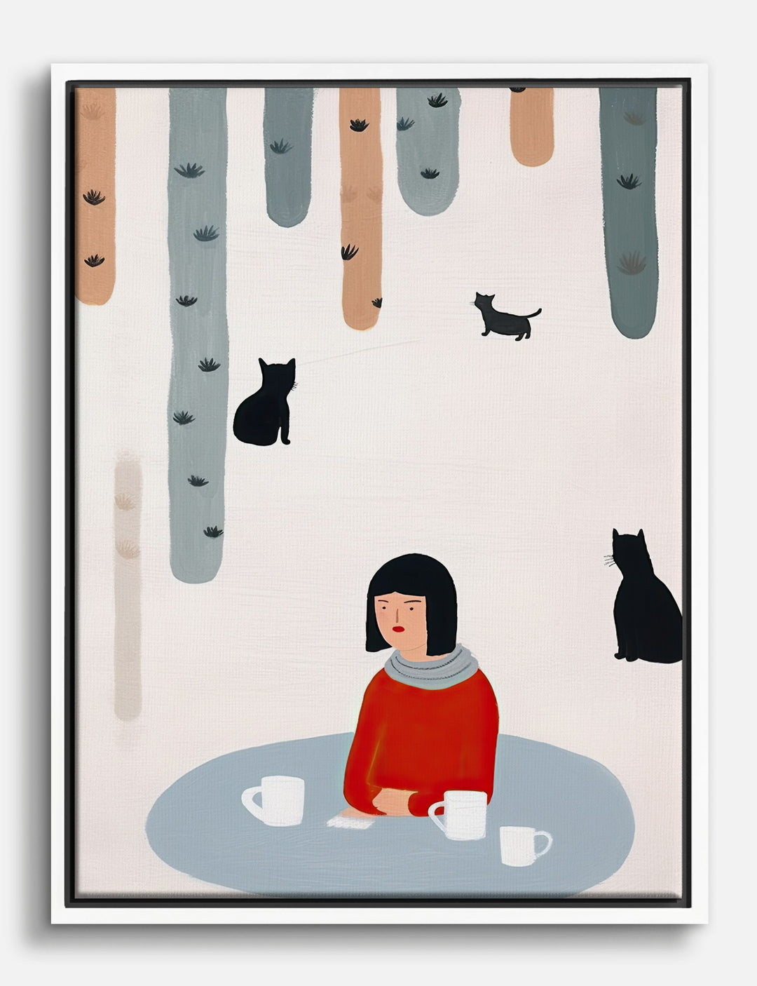 A quiet scene of soft mornings and gentle company, this piece brings a sense of calm and curiosity to your walls. With its muted palette and playful cats, it’s the perfect way to add a touch of whimsy and warmth to your living room or bedroom. The dreamy blend of blush, grey, and pops of red makes it easy to mix into any modern or minimalist decor. Let this artwork remind you every day that style and comfort go hand in hand—no renovation required.