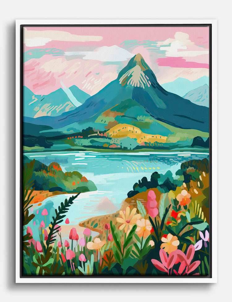 Step into a world where wildflowers bloom at your feet and mountains rise beyond a shimmering lake. This vibrant piece brings a rush of color and joy, making your walls feel alive and inviting. Imagine it brightening your living room or adding a playful pop to your bedroom—wherever it lands, youll feel instantly uplifted. The mix of lush greens, soft pinks, and bold blues play well with modern, boho, or eclectic spaces, giving you a stylish, effortless upgrade you’ll love showing off.