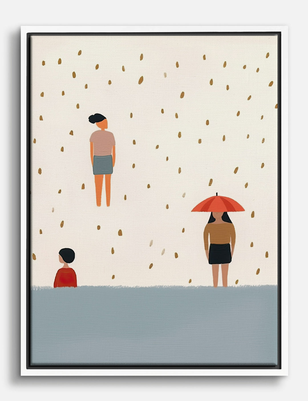 A gentle rain falls, but here, it feels more like a sprinkle of golden confetti. This playful piece brings a sense of calm and whimsy, perfect for sparking smiles in your living room or bedroom. The soft neutrals and pops of red and orange blend easily with modern or minimalist spaces, adding a touch of artful wonder to your everyday.