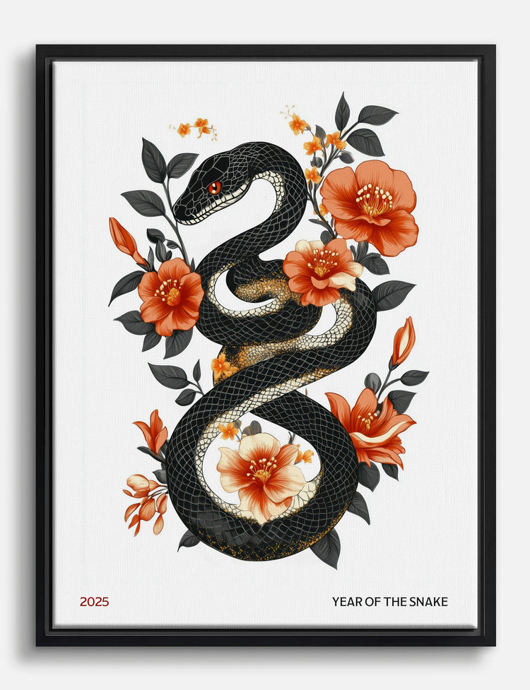 Bold, mysterious, and utterly captivating—this coiled black snake entwined with lush orange blossoms turns any wall into a statement. The striking contrast and delicate floral touches instantly energize your space, while the subtle nod to the Year of the Snake adds a layer of personal meaning.