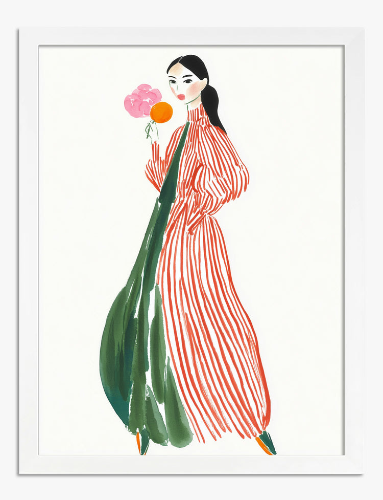 Bold stripes and soft florals meet in this effortlessly stylish piece, capturing the spirit of modern femininity. There’s a quiet confidence in her pose—a reminder that your space can reflect your own sense of poise and individuality. Picture this in your bedroom or dressing area, where its eye-catching palette of coral, green, and playful pink instantly energizes the room. The fashion-forward lines blend seamlessly with both minimalist and eclectic decor, making it a versatile statement for any style lover. Let this print be your daily nudge to embrace color, creativity, and self-expression. With Fab, adding a touch of runway-inspired charm to your home is as easy as hanging it up and letting your personality shine.