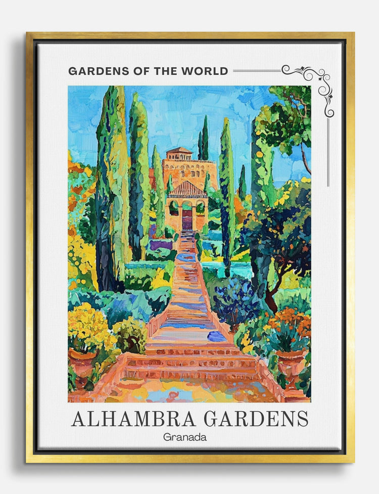 Step into a world where vibrant colors and lush landscapes meet. This artwork captures the serene beauty of Alhambra Gardens, inviting you to stroll through its sunlit paths. Perfect for your living room or office, its rich palette complements both modern and classic decor styles. Let this piece transform your space into a haven of style and tranquility.