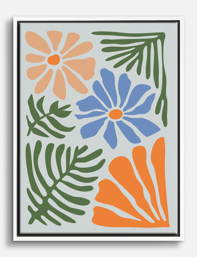 Fresh, playful, and effortlessly stylish—this floral piece brings a burst of color and energy to any room. Soft peach, bold blue, and lively green shapes create an inviting vibe, perfect for brightening up your favorite space.