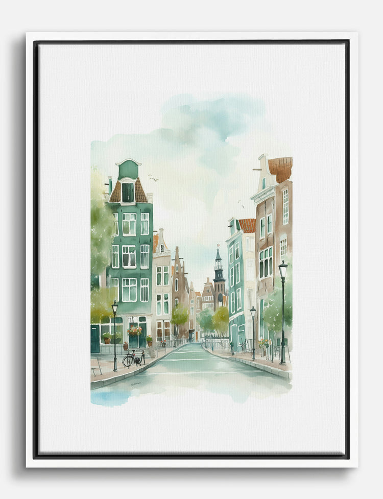 Step into a tranquil European street with this captivating watercolor. Soft greens and browns blend effortlessly, creating a soothing urban escape that fits beautifully in your living room or office. Imagine the pride of adding a touch of Amsterdams charm to your space, effortlessly elevating your decor with its unique, calming palette. This piece promises to transform any room into a haven of style and serenity, making great design accessible and affordable.