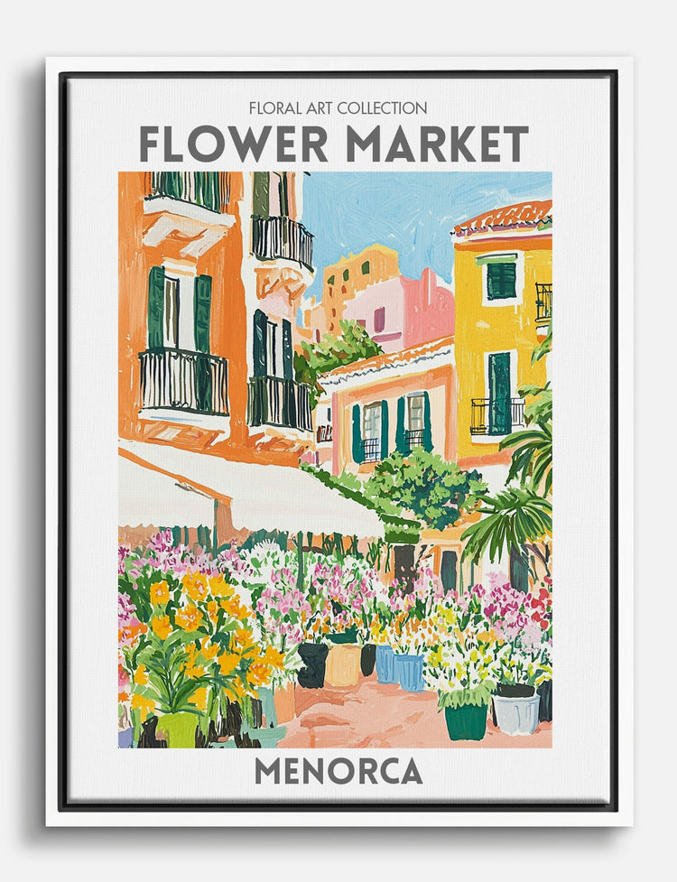 Step into a vibrant world where colors bloom and joy fills the air. This Menorca-inspired piece transforms any space with its lively depiction of a bustling flower market. Perfect for your living room or kitchen, the artworks warm palette of yellows and greens effortlessly complements modern and bohemian decor. Let it bring a touch of Mediterranean charm to your home, making every glance a joyous escape to sunlit streets and lush blossoms.
