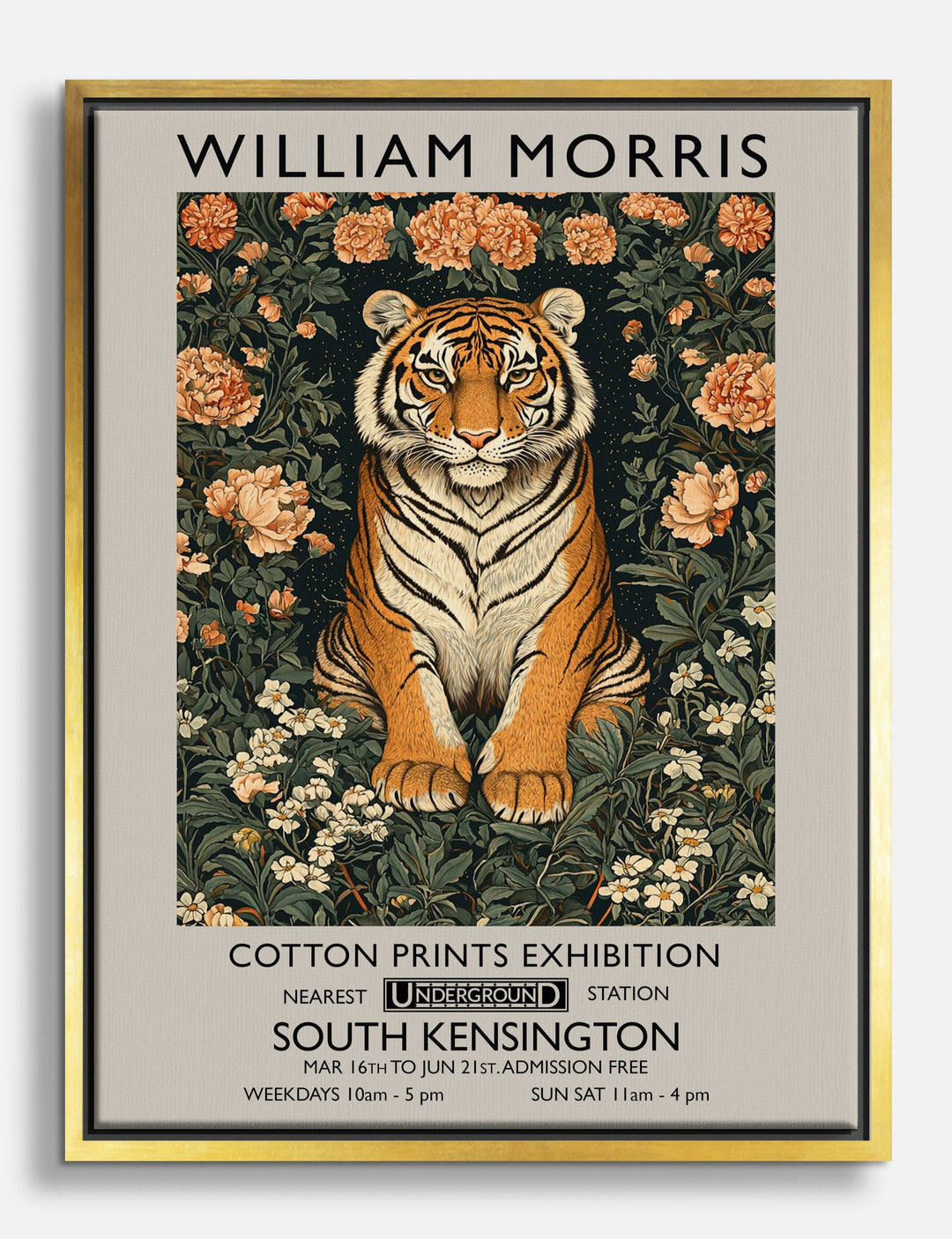 Step into a world where elegance meets the wild. This stunning artwork, inspired by the iconic style of William Morris, brings the majestic presence of a tiger surrounded by lush florals into your home. Perfect for your living room or bedroom, its rich colors and intricate details create an inviting and transformative atmosphere. Let your space be a testament to unique style and affordable luxury.