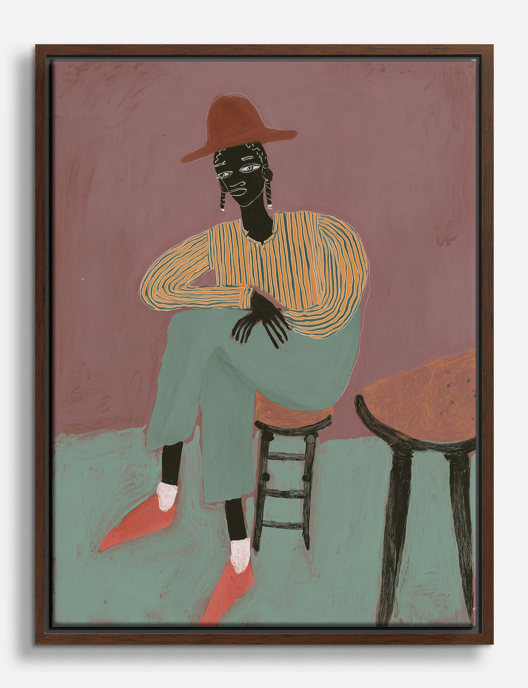 Bold style meets laid-back confidence in this striking portrait. A figure in a wide-brimmed hat and relaxed pose brings instant cool to your favorite corner. The warm, earthy palette of terracotta, sage, and gold stripes pops beautifully against soft mauve walls — effortlessly complementing both modern and eclectic spaces. Hang it in your living room or bedroom and let it spark conversation and creativity. This piece invites you to slow down, embrace your unique vibe, and make your space feel unmistakably yours. With its playful lines and contemporary flair, youll love how easy it is to transform your home with art that feels both personal and one-of-a-kind.